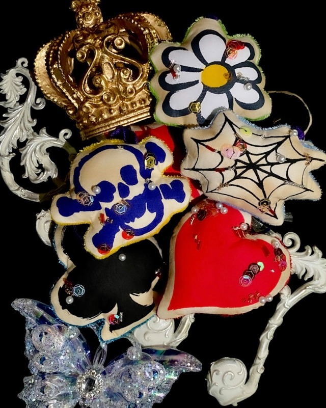 オリジナルグラフィックを使用した インテリアオーナメント 3点セット 素材 cotton / polyester / velveteen / acrylic / glas サイズ (cm) 本体: flower 7×7 skull 8×7 web 9×6 紐: 9 多少前後します ※ 一点ずつ手作業で製作しているため、大きさや柄の出方、ビーズ装飾の位置など多少の個体差が生じます。あらかじめご了承ください。 ※ ヴィンテージのような風合いを出すため、表側はムラ染め生地を使用しています。 ※ 使用する生地やタグなどの細かな仕様は、事前告知なく変更する場合がございます。写真はあくまでもサンプルですのでご理解いただけますと幸いです。