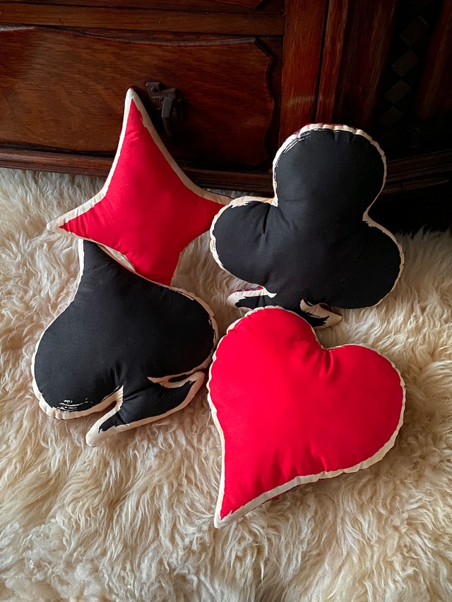 オリジナルグラフィックを使用したピロードール ヴィンテージのような風合いを出すため、表側はムラ染め生地に染み込みインクを使用。裏側には温かみのあるチェック柄のキルト生地を合わせました。 素材 cotton サイズ (縦×横 cm) ♡: 25×28 ♧: 27×29 ♢: 27×32 ♤: 27×29 多少前後します ※ 一点ずつ手作業で製作しているため、大きさや柄の出方など多少の個体差が生じます。あらかじめご了承ください。 ※プリント部分は強く擦ることで、色移りの可能性があります。 ※使用する生地やタグなどの細かな仕様は、事前告知なく変更する場合がございます。写真はあくまでもサンプルですのでご理解いただけますと幸いです。